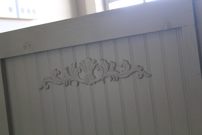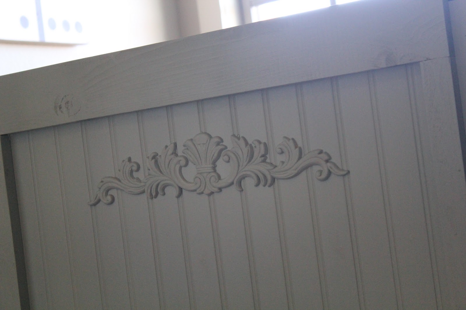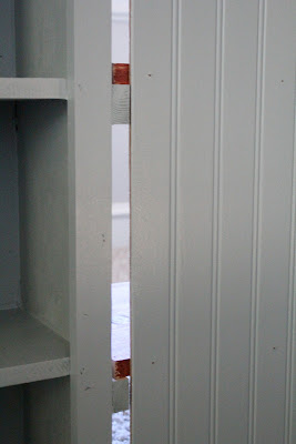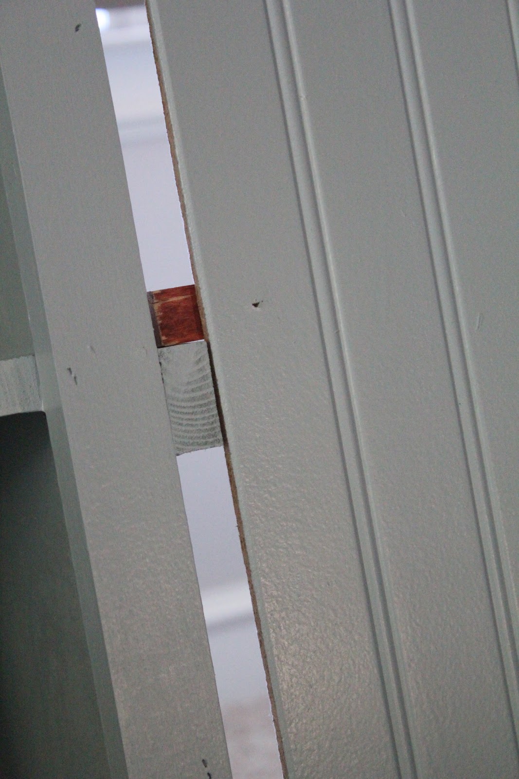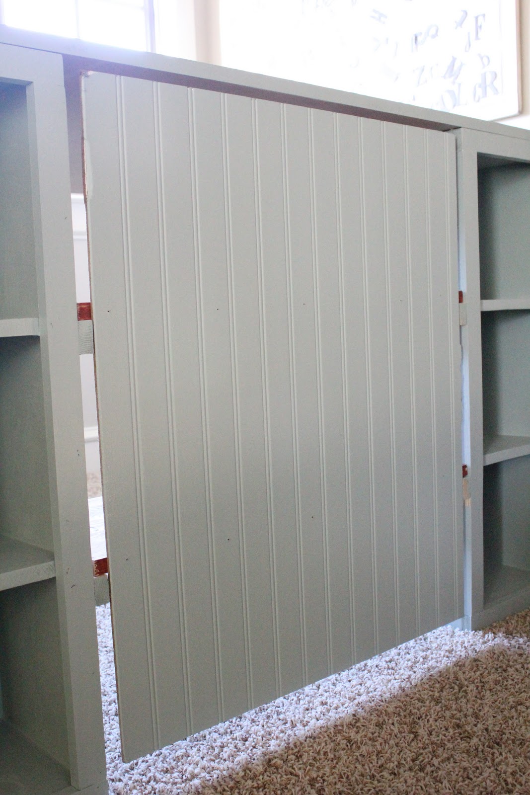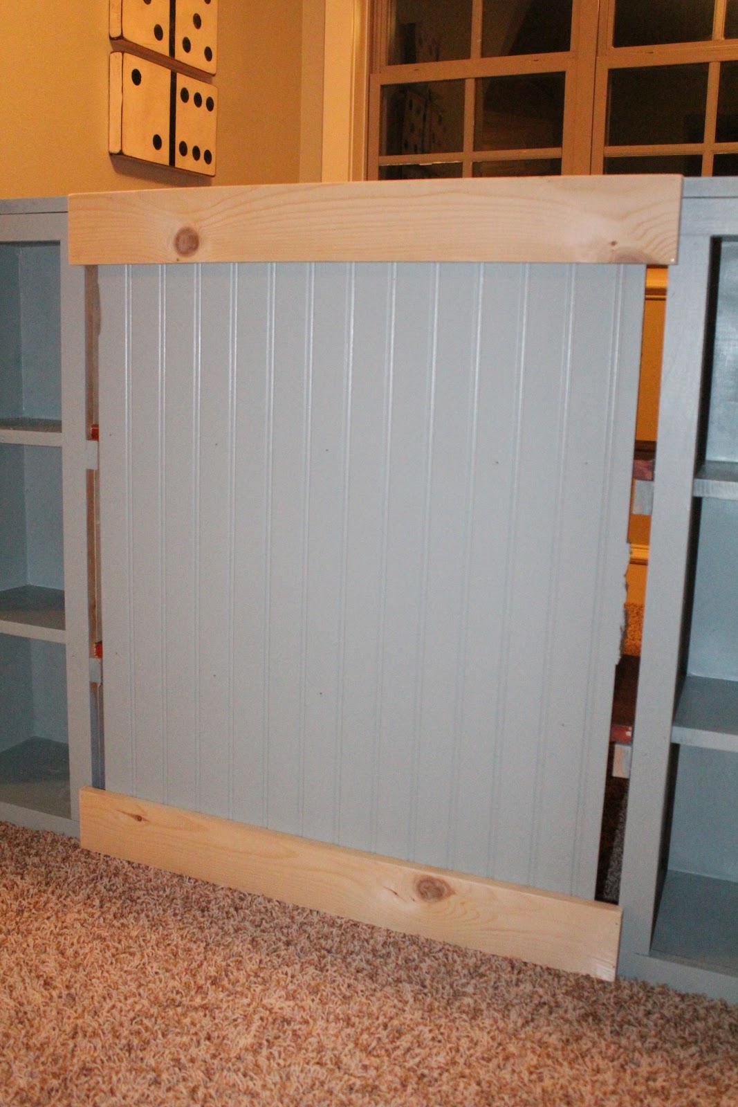 Next I added my bead board. I had leftover from my last table project and I painted it in the garage before attaching it. I cut mine to fit just into my open space and attached it with my nailer to the back of the shelves.