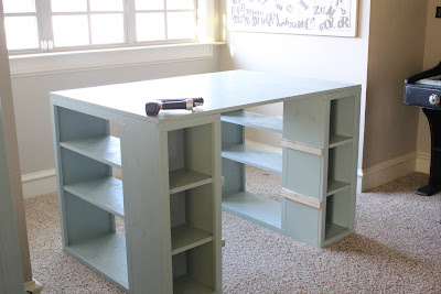 I took my three separate pieces up into my loft where my table will be and put the top piece of mdf on my two bases. I go everything lined up perfectly and then used a 1 1/4″ wood screw on each corner to secure the top. I attached the screws from the underside of my bases so you wouldn’t see them on the top.