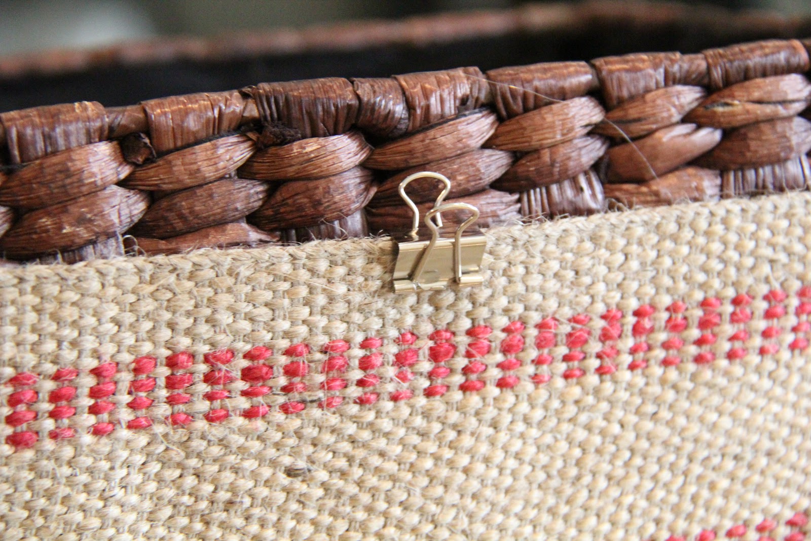 The next step is simple… Just hot glue your jute webbing to the basket. I eyeballed mine and pretty much stayed centered 🙂