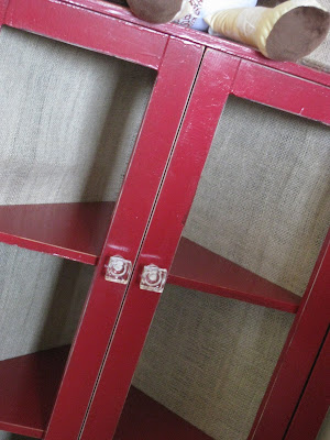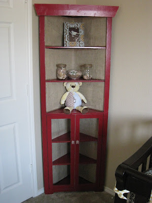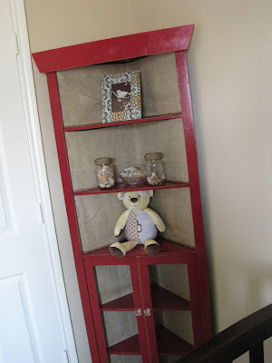 She got a fresh coat of red paint. This is the same color that I used on her dresser. I had it matched to the bedding at Home Depot. I left the burlap on the back side because I love it! I also had to change the top molding piece out because it kept the hutch from fitting in this corner. I just ripped it off and replaced it with a 1×4.