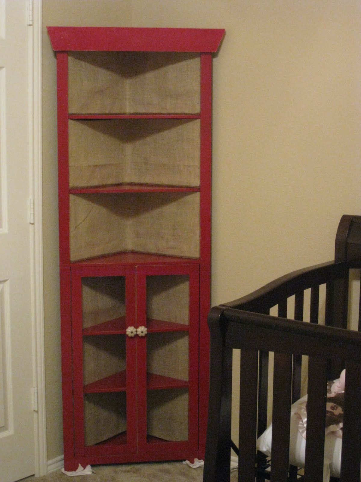 She got a fresh coat of red paint. This is the same color that I used on her dresser. I had it matched to the bedding at Home Depot. I left the burlap on the back side because I love it! I also had to change the top molding piece out because it kept the hutch from fitting in this corner. I just ripped it off and replaced it with a 1×4.