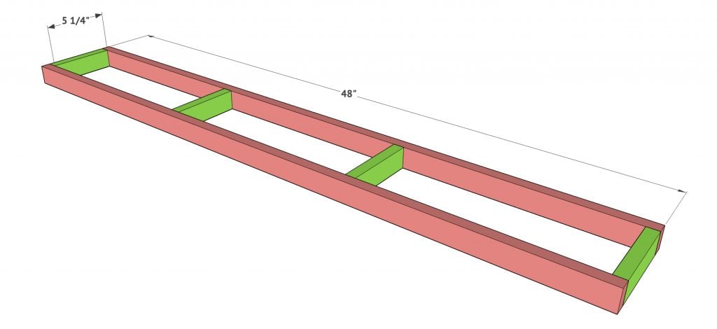 Now we are building the frame of the shelf. This is built using 1×2 boards. Once you make your cuts, you will attach everything using wood glue and 1.25″ brad nails.