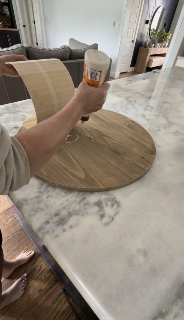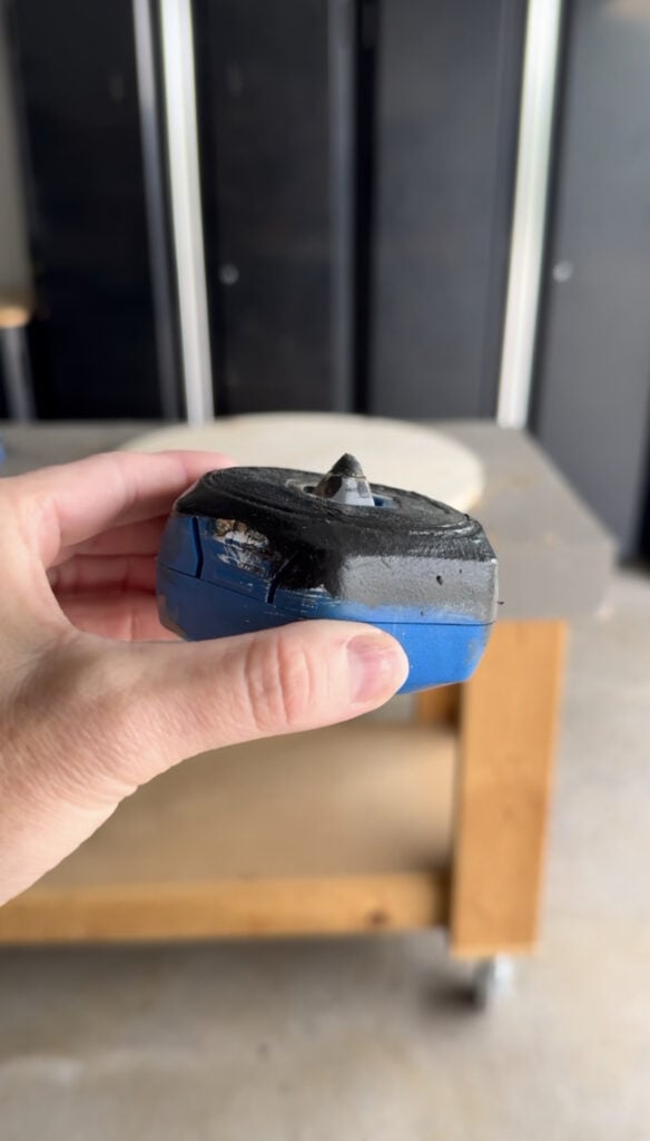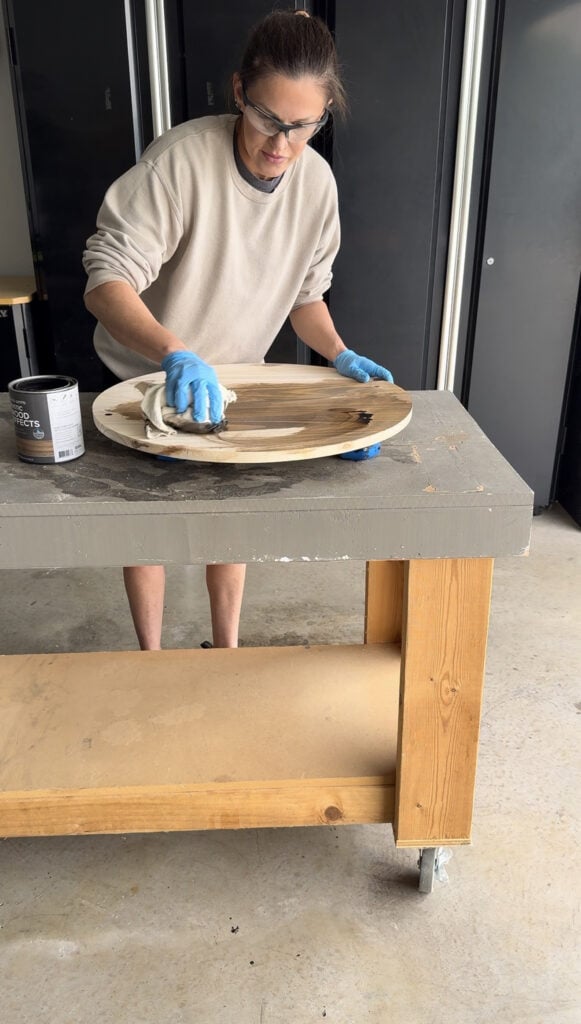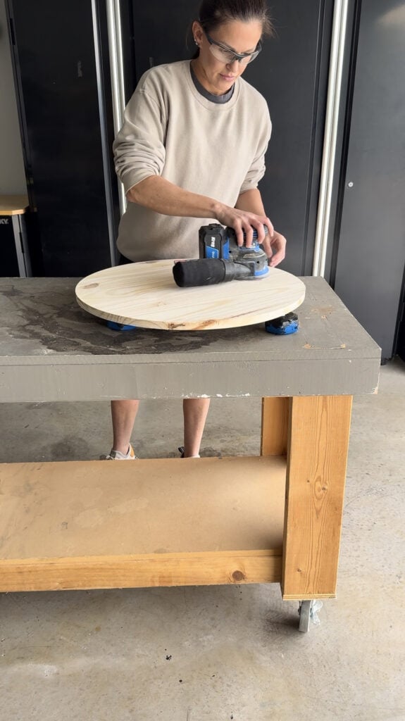 To sand the whole circle down, I used my new Kreg 20V Ionic Drive Random Orbit Sander. I love how lightweight this sander is, it’s become a quick favorite! I used an 80-grit sand pad followed by a 120-grit. This step makes a big difference in how your finish looks, so it’s worth taking your time here.