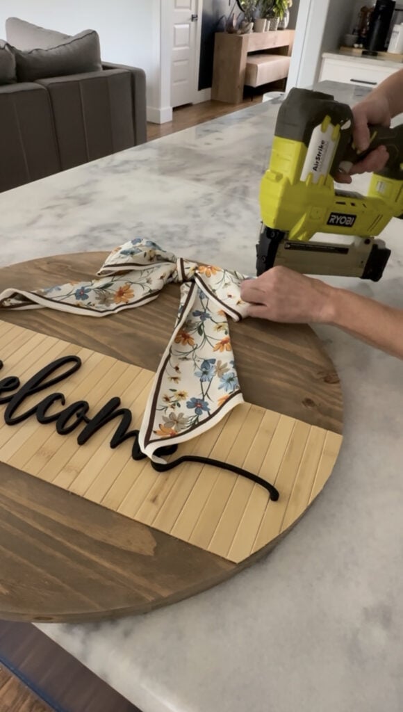 Then create a simple bow using a ribbon or scarf and staple it to the top of the door hanger.