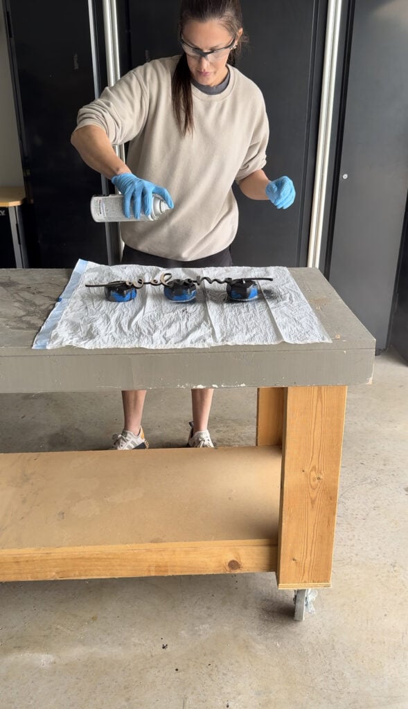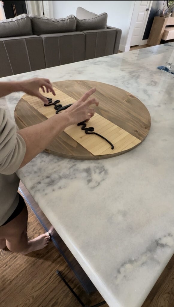 While that’s drying, paint your lettering piece. I cut my “Welcome” sign from 1/8″ MDF (I used my Glowforge but you can find something similar at a craft store already cut) and spray painted it black. This is where you can really customize the look depending on your style.