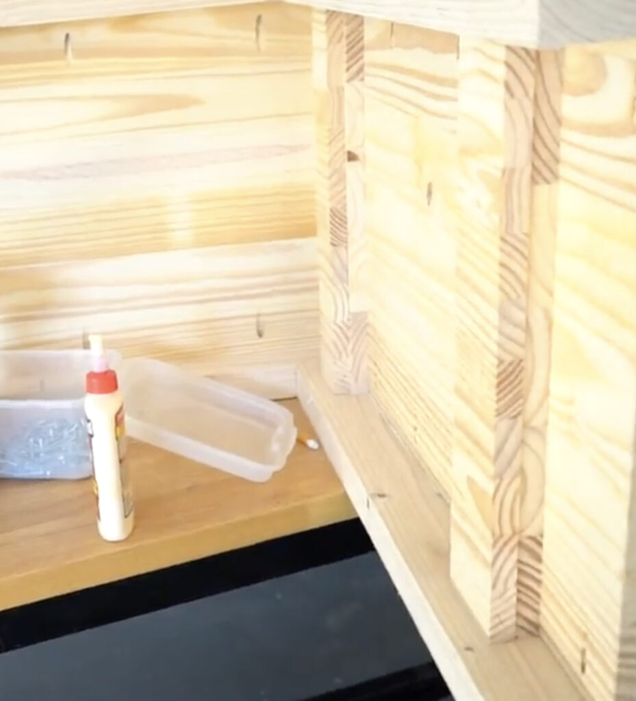 Cut additional pine panels to fit the inside of the console sides and top. These cover the supports and pocket holes, giving that seamless “waterfall” finish. Use glue and brad nails to attach.