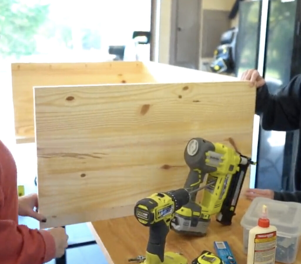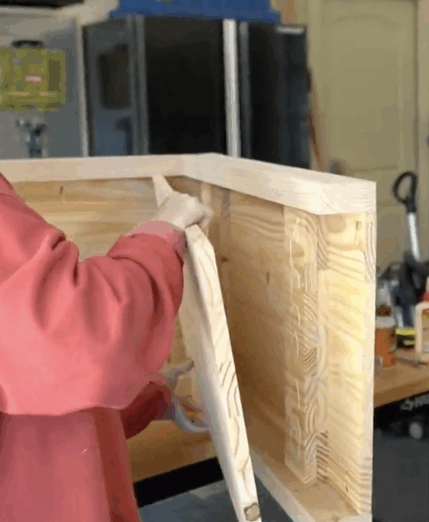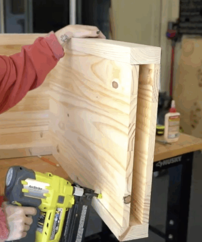 Cut 3” wide strips from scrap panels and attach them to the inside of each side panel — two on each side, one toward the top, one toward the bottom. Use brad nails and wood glue to secure.