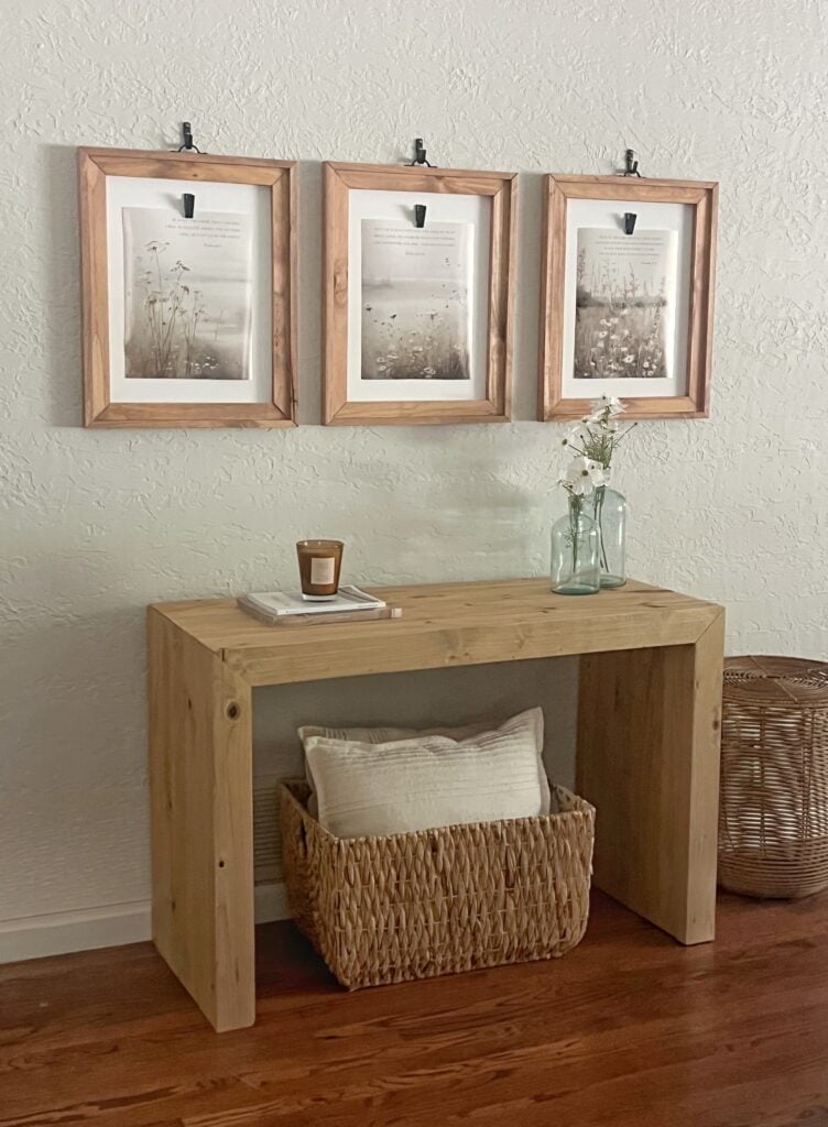Originally designed as a writing desk for my college-aged daughter, this piece quickly proved it could do double-duty. With its minimal profile and “waterfall” edge design, it’s the perfect modern console for small spaces. We’ve styled it as a console here, and I love how versatile it is — think entryway table, narrow hallway shelf, or even a stylish vanity setup. Customize the length, width, and finish to fit your space and style. And you can build it for under $100!