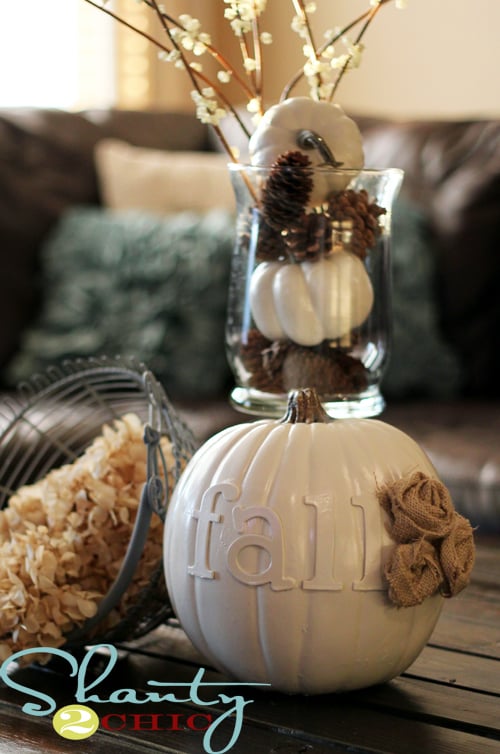 How fun! 🙂 I chose to decorate with white pumpkins and lots of warm brown accents this fall too – so I love your color combo! 🙂 The burlap flowers are such a fun touch! Thanks for sharing!