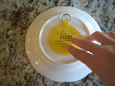 You start by cleaning the back of your plate off.  After doing that, use your finger to dampen the back of the disc with a little bit of water.  This activates the glue.