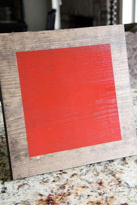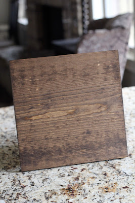 After cutting my wood I used a dark mahogany stain with a foam brush to stain each of my pieces. I let the stain soak for about 15 minutes and then wiped off the excess.