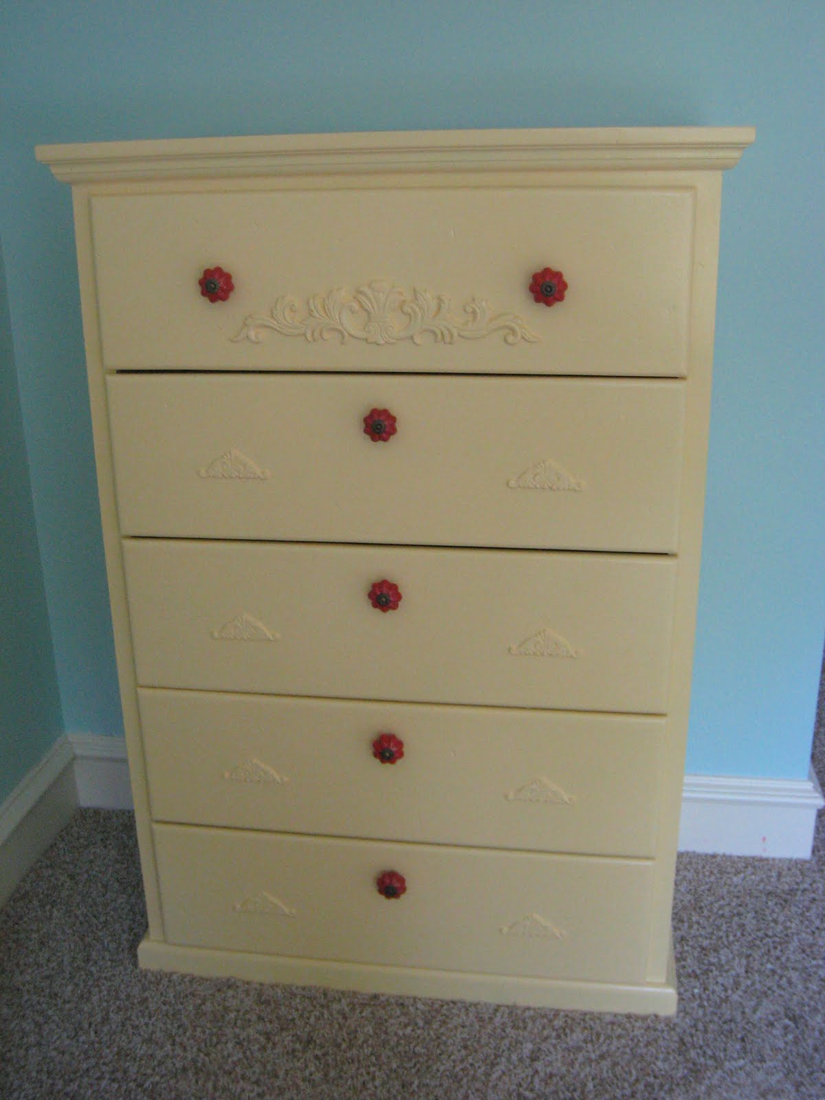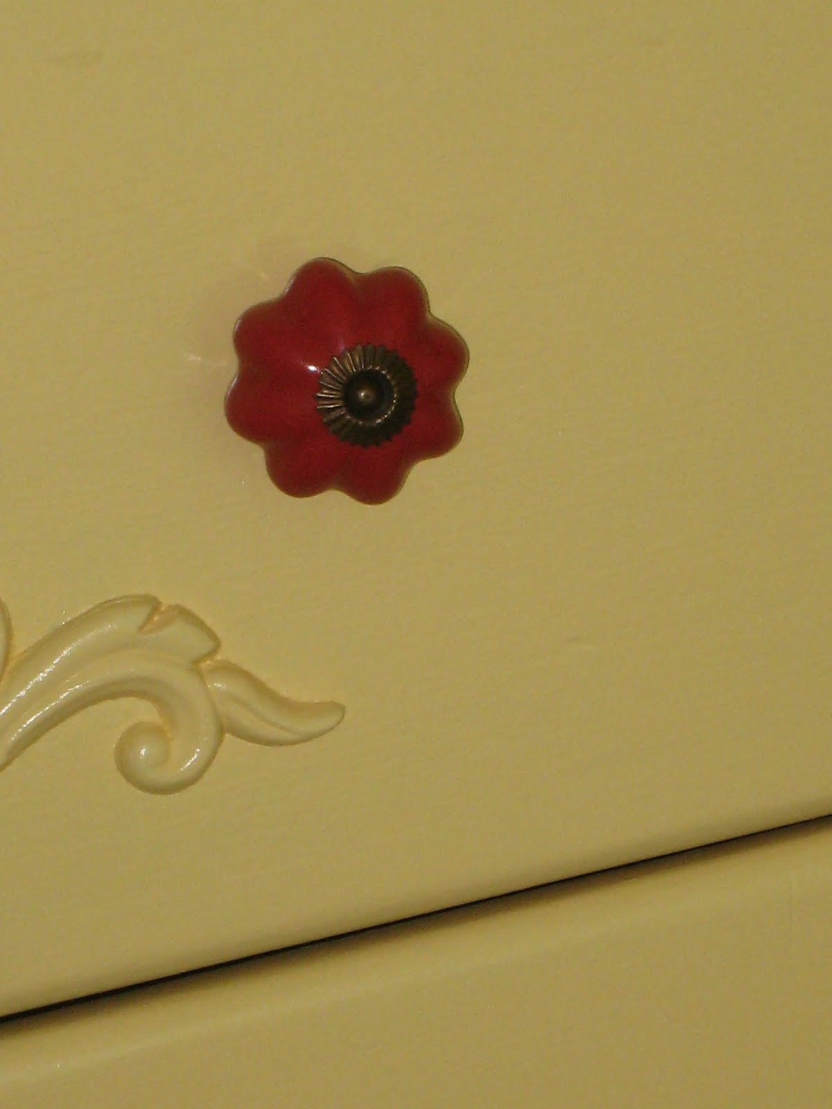 I would normally sand and glaze almost anything I paint but I really loved the clean and bright look of these just like they were. I found some great red knobs at Hobby Lobby for $2 a piece… Woohoo! I think they tie each piece together so well and I love the outcome! Wait until you see it with the bedding!!