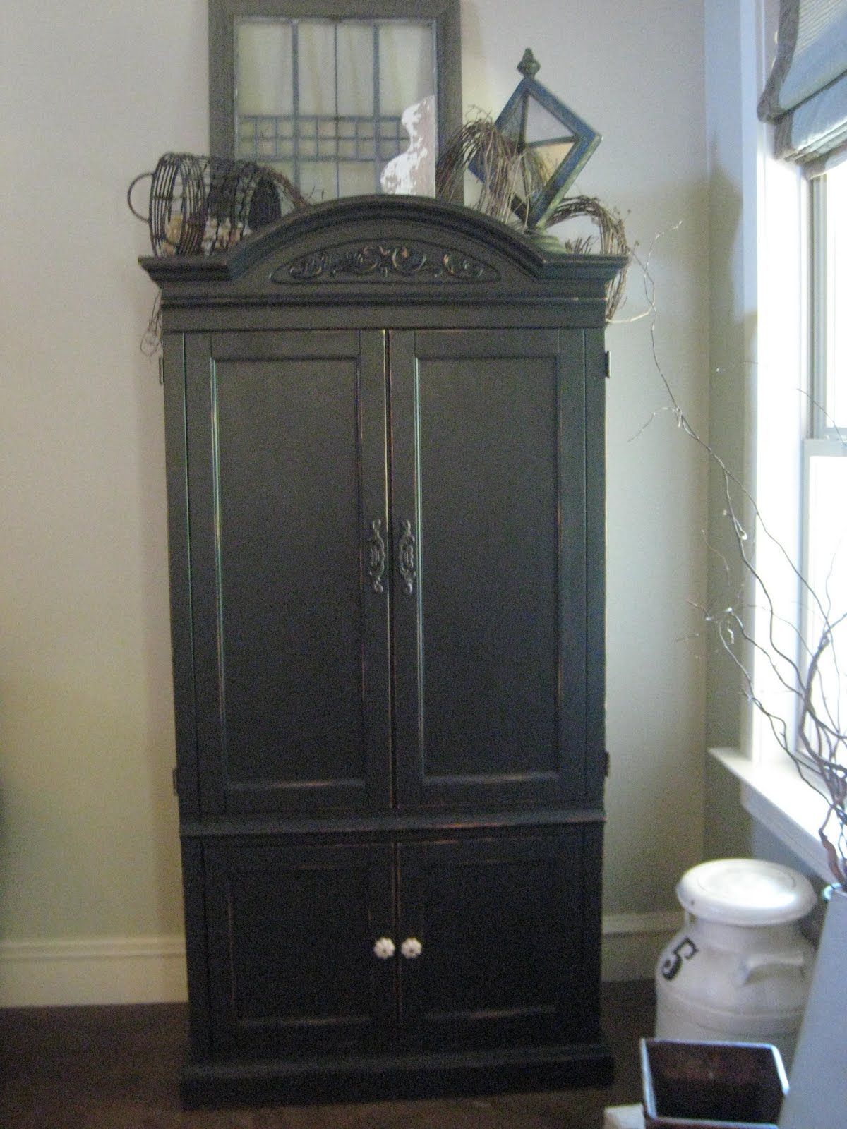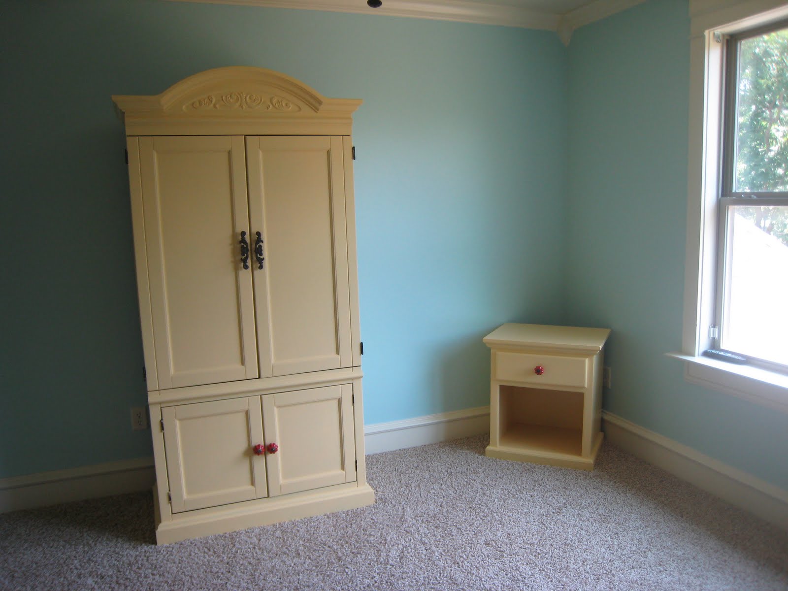 My other amazing pregnant sister offered to come over and paint the other night and I had to take her up on it. Thanks Squeash! We taped off all the trim, removed plate covers and put plastic on the carpet. That furniture in the picture is what I will be using in the baby’s room as well. It started as a pale minty green with pink knobs. I matched the yellow in the bedding and gave each piece two good coats of paint. I also wanted an armoire for her room and I had this down in my living room.