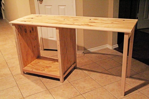 This is a picture of the underside of the top of the desk with the pocket holes drilled to attach the front and back trim.