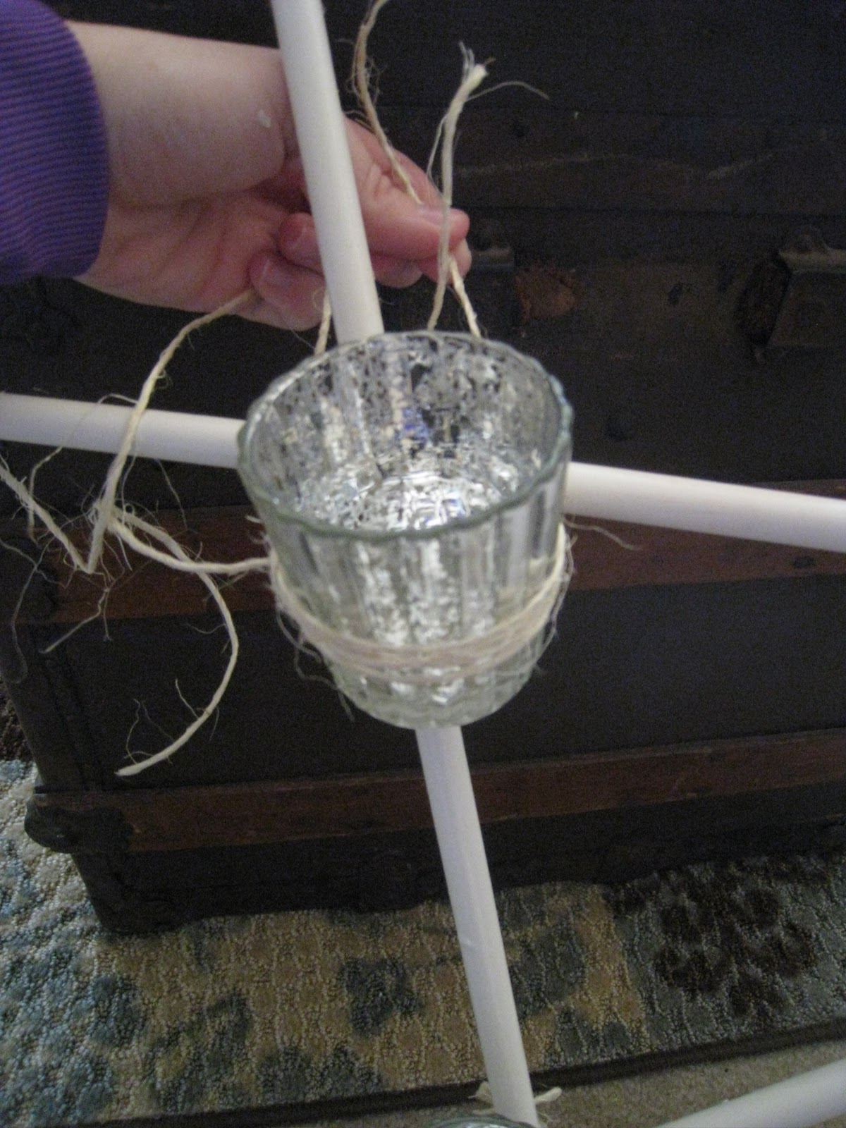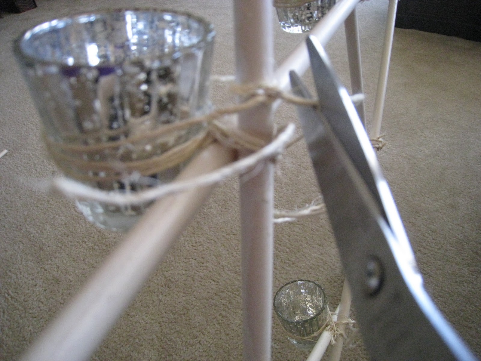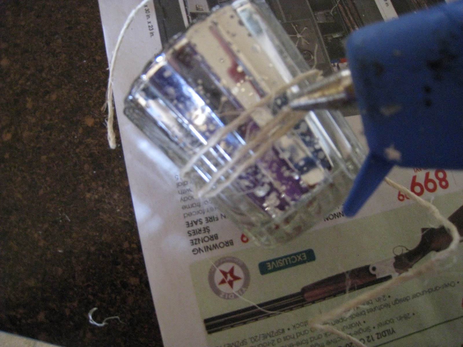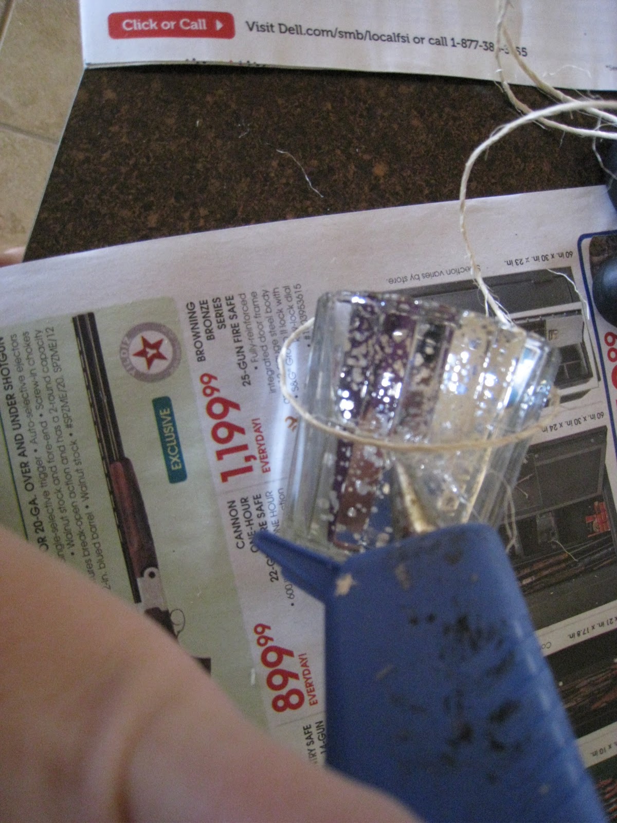 I used 1 ply jute and wrapped it 3 times around each votive hot gluing as I went.