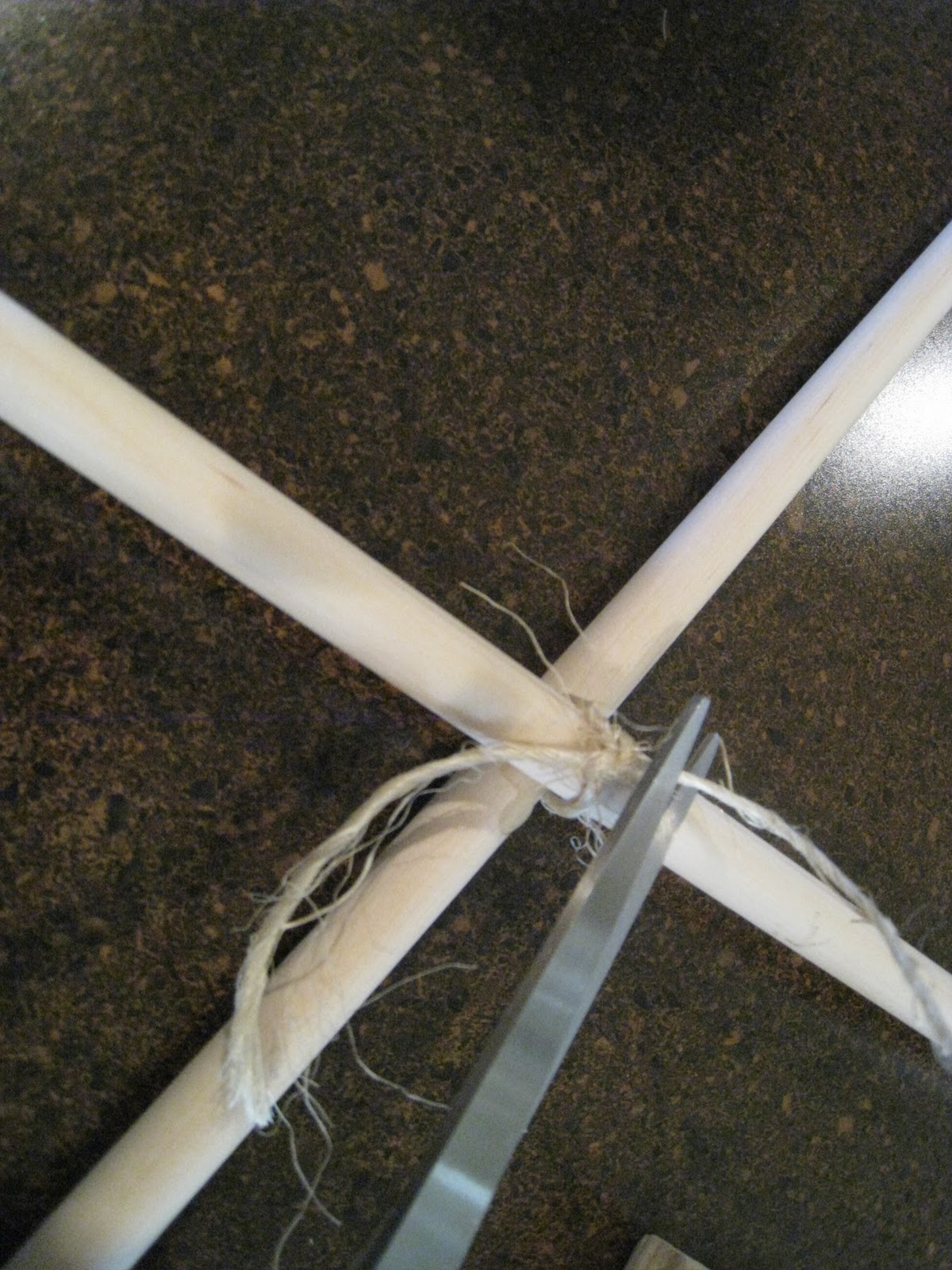 Start with 5 dowel rods. I purchased them at Wal-Mart for $.70 each.