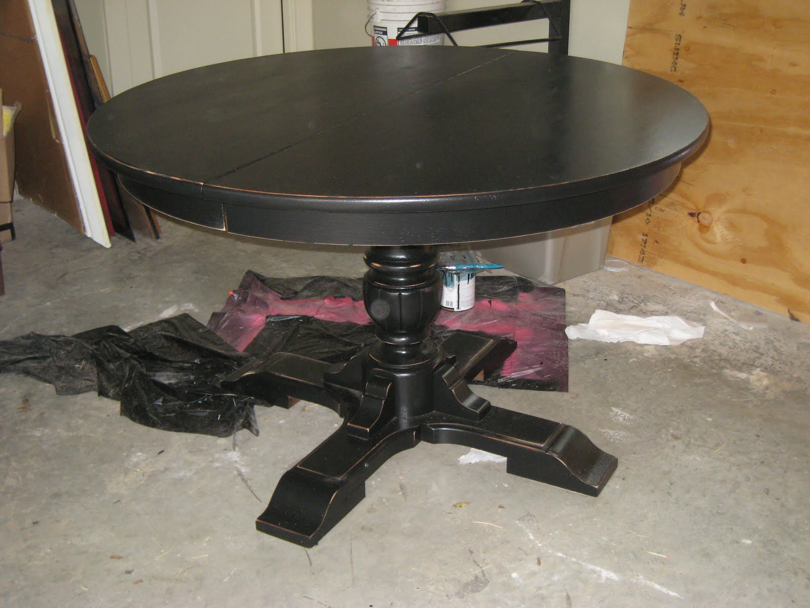 I opened the table up and set the leaf inside leaving a bit of space on each side. I used Behr black satin interior paint. I never pick a color card. Just tell the paint guy or gal that you want black. I cleaned the top off just a bit and painted the entire piece. Here it is drying.