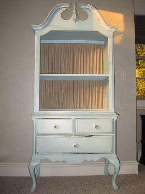sooooo darn cute! love what you did with the burlap. very creative! wann aknow something funny? I just picked up a wall clock that has the EXACT chape of your hutch!even down to the little finnial in the center top of it. Too funny! If you want to see it you can check it out at http://trash2mytreasure.blogspot.com/2009/09/fabulous-finds-1.html